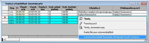 8. Աշխատաժամանակի հաշվարկի տեղեկագիրը պահանջվող տեսքով ստանալու համար “Տաբելի փաստաթղթեր” թղթապանակում նշել անհրաժեշտ տաբելի փաստաթղթերը (այդ թվում` այն երկու տաբելների փաստաթղթերը, որոնք ստեղծվել են փոփոխության ենթարկված աշխատակցի (կամ աշխատակիցների) համար).