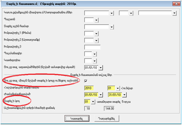 6. Տաբելի հաստատման երկխոսության պատուհանի “ժամանակահատված” դաշտում լրացնել հնգօրյա տաբելի գործողության ժամանակահատվածը:
